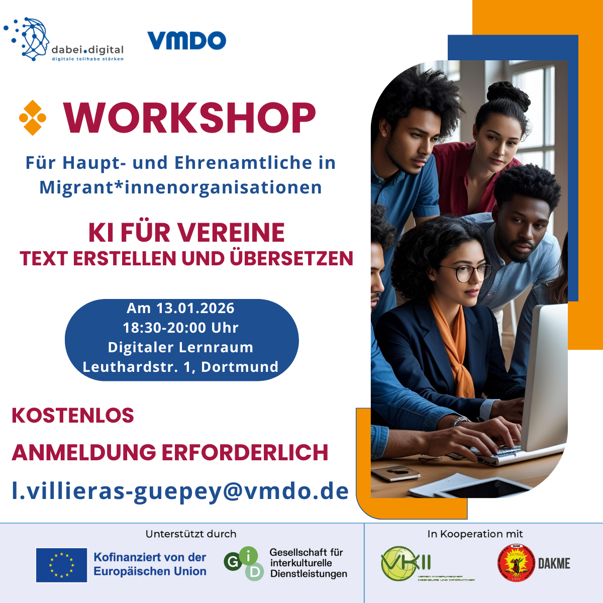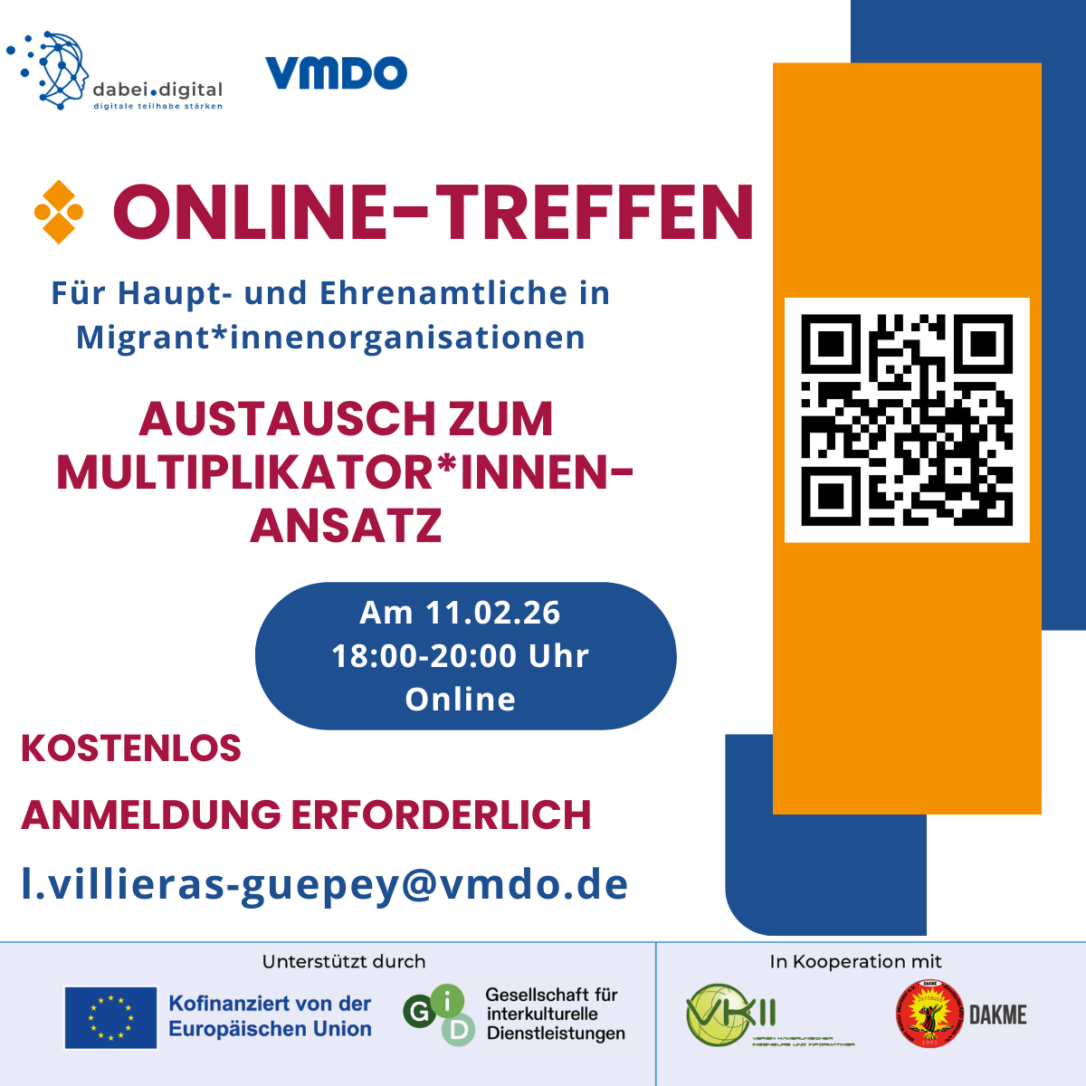 Auf dieser Seite findest du einen Überblick über alle Veranstaltungen von dabei.digital für Migrantenorganisationen und Drittstaatsangehörige – von kommenden Terminen bis hin zu Rückblicken auf vergangene Aktionen. Entdecke wie wir digitale Teilhabe gemeinsam gestalten!